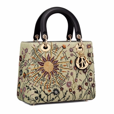 【包邮包税】DIOR/迪奥 2020春夏新款 Lady Dior系列 淡黄色小牛皮拼接彩绣中号戴妃包手提包 M0565OURV_M886